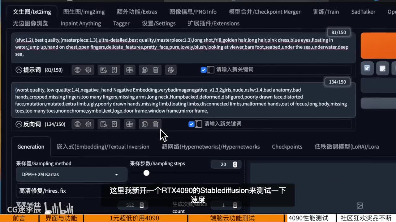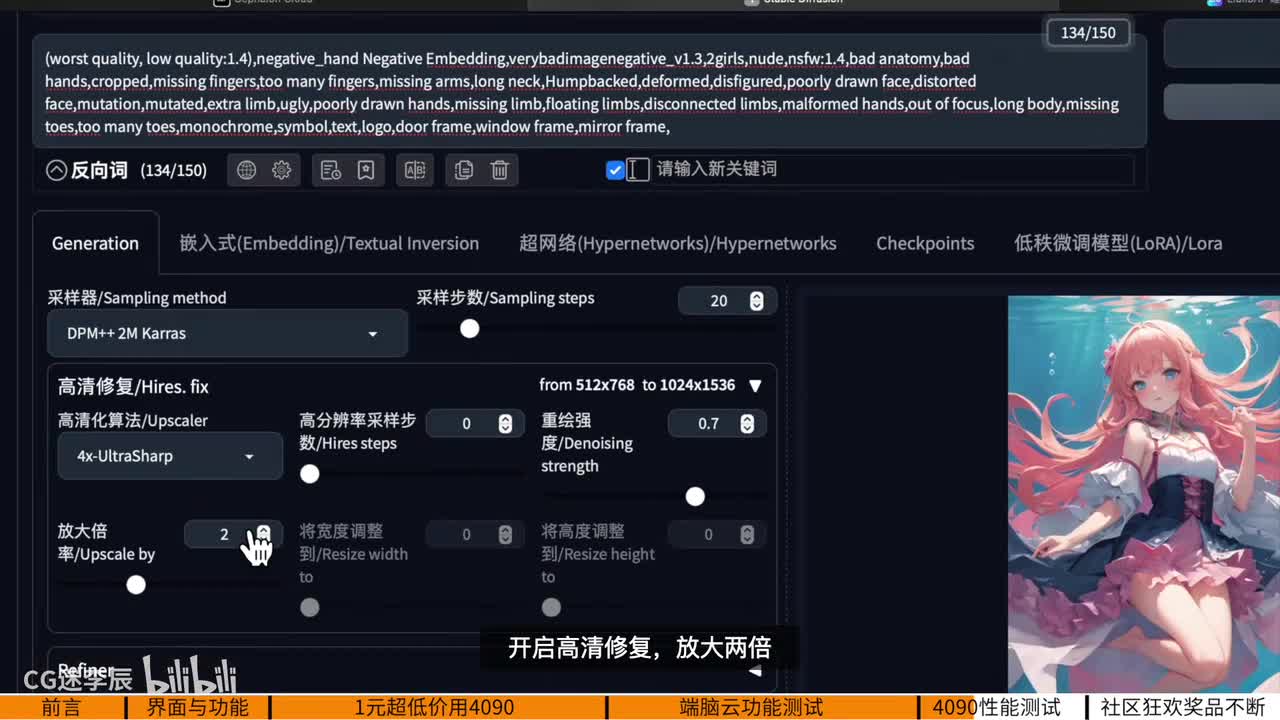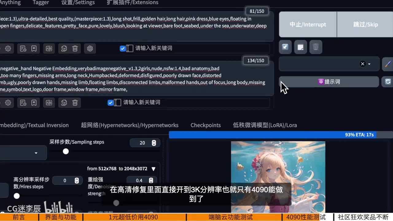 可以看到当前配置的显存是二十四g b既然用的是四零九零。基础分辨率肯定是满足不了我们的,开启高清修复放大两倍。现在分辨率去到一点五k点击生成用时是二十六秒,显存占用仅仅用了百分之五十三。