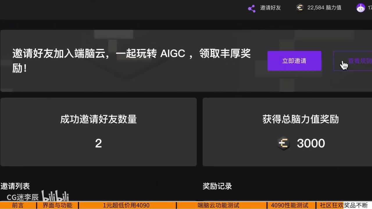 超低的价格用上顶配的四零九零算力,值得推荐一下。如果你在使用过后也觉得不错的话,那么可以参与一下端脑云的拉新奖励活动,通过页面的邀请功能把邀请链接发给好友,成功邀请后可以获得一千脑力值。同时邀请用户每充一百元,推广人也可以获得五十元的脑力值奖励。