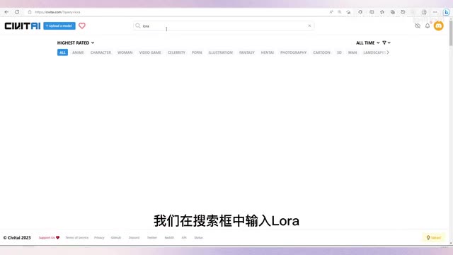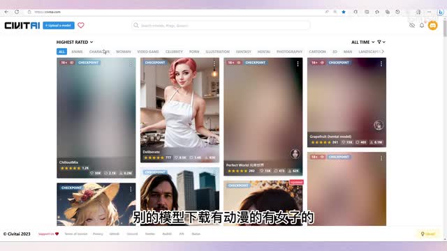 现在开始介绍如何下载并使用模型。我们点开c站主页可以看到这里提供了很多绘图类别的模型下载。有动漫的,有女子的,有游戏的,还有卡通的等等。往下每个模型的缩略图左上角都会标注这个模型的类别。