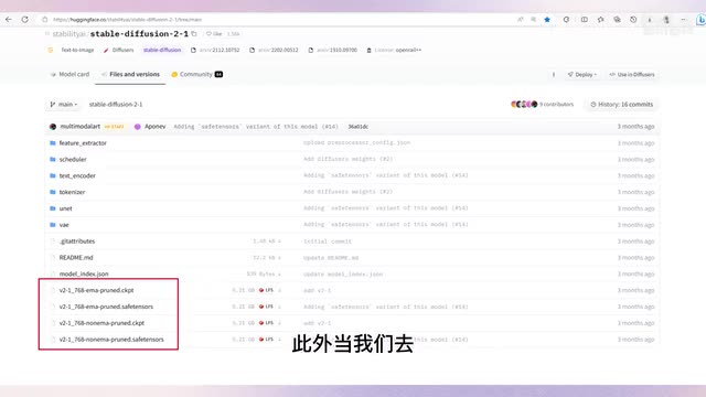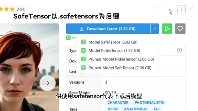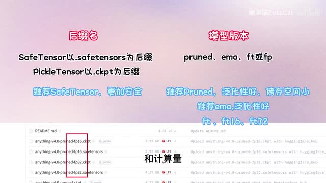 这里还要再学习几个专业名词。我们点击c c t模型的下载按钮后,有时候会看到模型提供了多个版本供使用。safe tensor代表下载后模型以safe tensor为后缀。pick tensor代表下载后,模型以c k p t为后缀。