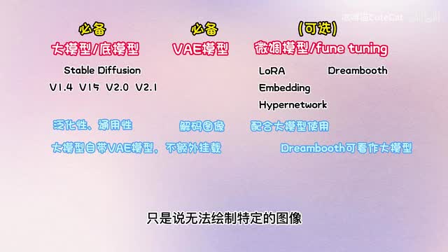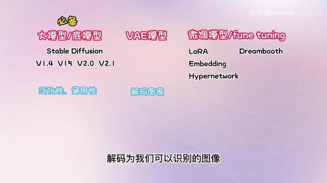 大模型也有叫做d模型,包含了数以亿计的参数。像stable diffusion的一点四版本、一点五版本、二点零版本和二点一版本均属于大模型,具备泛化性,这是绘图时候必须要有的模型。v a e模型是在图像生成的最后将图像在潜在空间中的隐变量latent variable解码为我们可以识别的图像,这也是绘图必须有的模型。只是有时候大模型内部已经内嵌了v a e模型,就不需要我们额外添加了laura dream booth embedding hyper network这几个均属于在大模型的基础上的微调模型,能帮助绘制出特定风格和特定任务的图像,它们是可选的,根据你的需要添加。