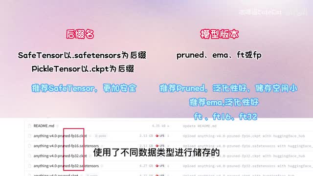 一般选择e m a优化后的模型会更好。有时候模型的文件名上还会看到s t s t一六、s t三二这类单词,这代表模型数据使用了不同数据类型。进行储存的f t十六、f t三二分别代表了单精度和半精度浮点数。简单理解就是f t三二相比于s t十六保留了更多小数。