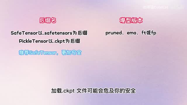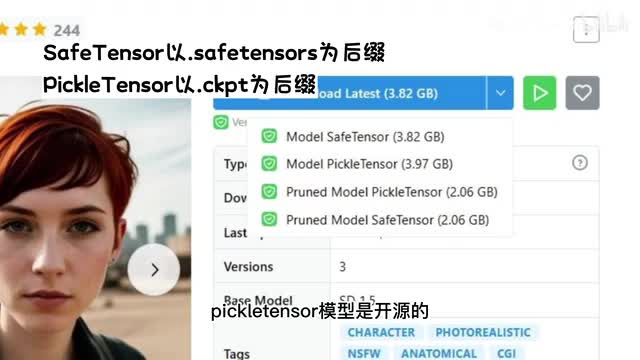 这两种模型本质上是一样的,只是safe tensor是受到加密保护的,我们无法用编程的形式直接读取参数,除非获得开发者提供的密钥。而pico tensor是不受加密保护。换句话说,pick tensor模型是开源的,safe tensor是不开源的。c tensor格式是由hugging in face推出,据说它的加载速度比c k p t更快,将会逐渐取代c k p t p t e等格式,并且更加安全,不会包含恶意代码。