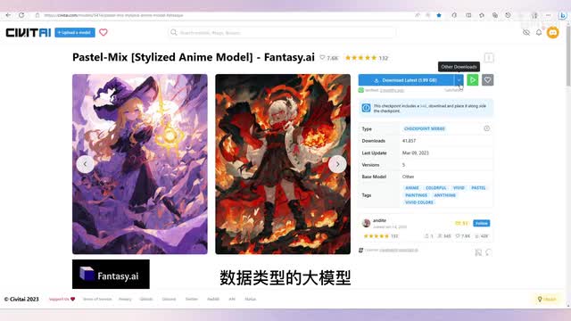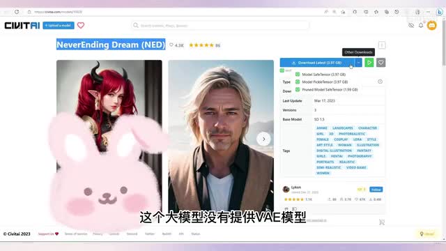正如之前介绍的,laura模型是在大模型的基础上微调而来的。所以为了画出这种风格的人物,我们还要下载大模型。那配合这种laura的大模型是什么呢?往下在这里可以看到发布者介绍说大模型是这个叫never ending dream nad的模型。点击这张写实风格的人物可以看到,在这个位置也显示说大模型是never ending dream这个模型。