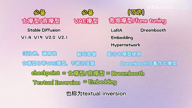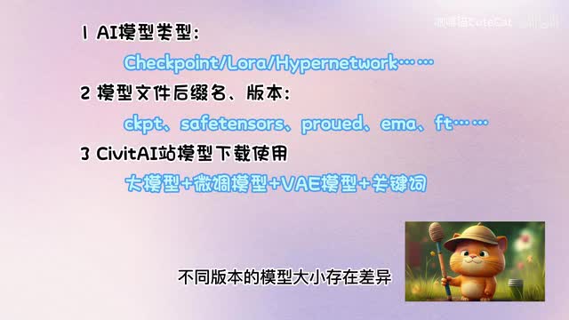大家好,我是咖啡猫,欢迎来到我的视频。当我们欣赏到一些令人惊叹的k a i绘图作品时,是否也想要自己创作一幅呢?但是当我们从网上下载stable diffusion模型,使用了相同的关键词tag,却往往达不到宣传的效果,这是因为决定绘图好坏的不仅仅是写好关键词tag这么简单。另一方面,网络上可供下载的模型往往提供多个版本,不同版本的模型大小存在差异,我们应该如何选择呢?c b t i网站提供了众多免费的stable diffusion的模型,点开后有的显示chap,有有的显示textron inversion或者ura或者hyper network,这些又该如何选择使用呢?今天咖啡猫就来告诉大家如何从c站下载模型并正确使用它们以达到理想的绘图效果。我们先来简单区分一下这几个模型的概念。