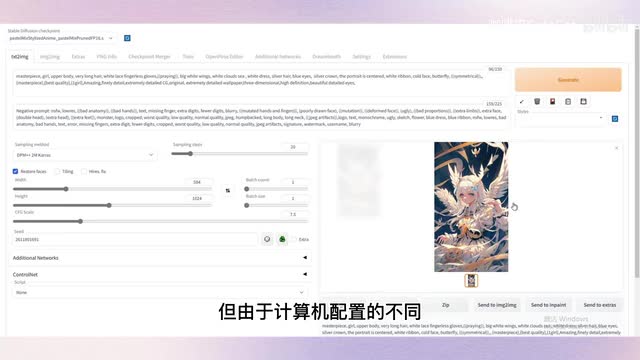 这下面还有一些具体的参数设置,我们按照这种设置填好参数,把种子数也复制过来,图片大小选择五百八十八乘一千零二十四,运行一下,可以看到生成的图像已经非常类似了。但由于计算机配置的不同,生成的结果难免有些差异。我们再来试试,如果不使用他们给的v a e模型会是什么效果。是不是有点灰蒙蒙的感觉,色彩饱和度明显低了不少。