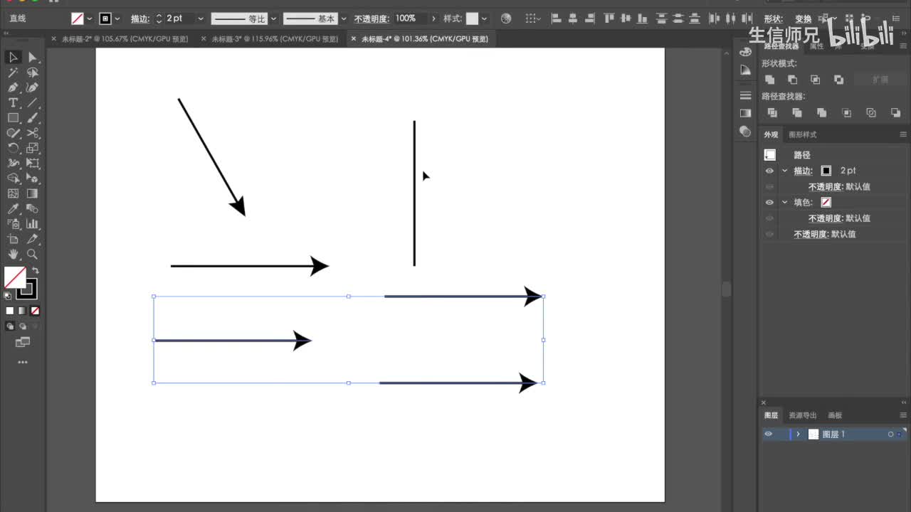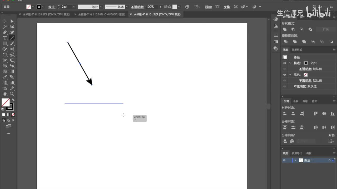 那我一般就选一个五百乘四百的。好,我们看一下这个界面,左边这一块是工具栏,上面呢可以调一些属性。然后右边是我们的一些个简单的,比如说路径查找器啊、属性啊、对齐啊、色板啊、画笔啊这些个。首先我们。第一个我们要讲的工具就是直线工具。这个直线工具我们最常用的就是用它来画一个箭头,对吧?好,我们首先看一下直线工具怎么画这个箭头,我们随随便拉一条线出来。这条线呢它有宽度,它有它的粗细,对吧?我们怎么调它的粗细呢?就从这里开始描边,可以调到粗细。可以把它调成两个p p。两个p t。然后呢。这个描边把它点开,底下这可以这里可以设置箭头。比如说这里是箭头的出发的这一边,你可以把它设置成这个样子。