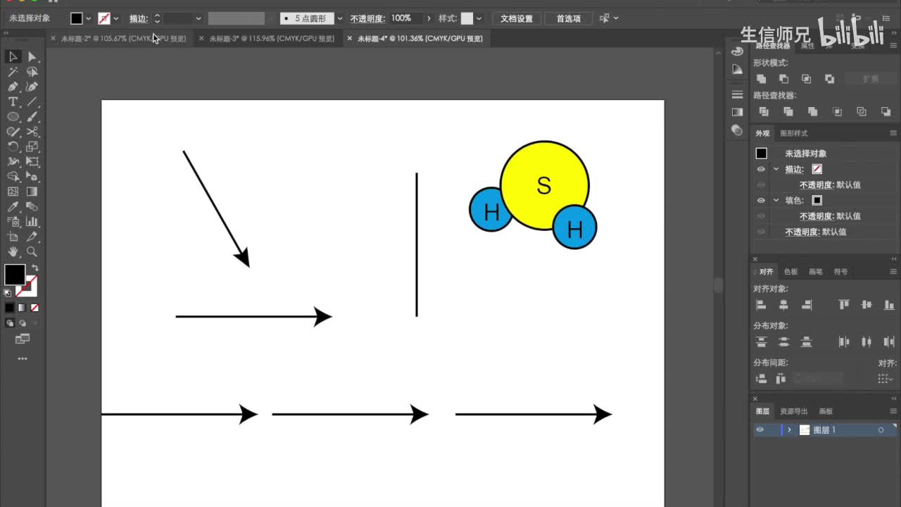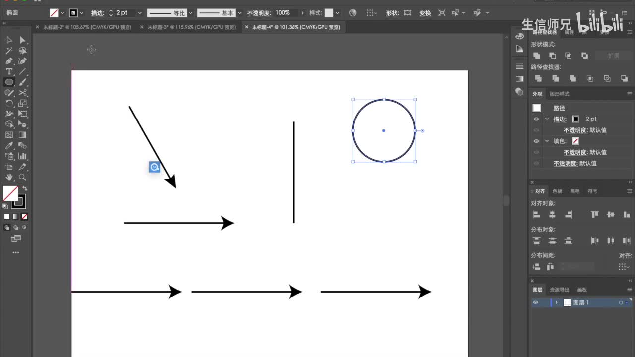我想把这些箭头按照我们想要的水平方向把它做一个对齐,怎么办?那么我们就会就可以看到。这里有这些个对齐的。快捷操作。这边也有。这个可以都可以在窗口这边调出来啊。比如说我们想把对齐关掉,我们就在这里把这个对齐,不要啊,这里就没有了,对吧?如果想把对齐打开呢,也可以在窗口这里把它选上。好,这跟p s是差不多的。那么熟悉p x的人入入门a i也是挺快的。所以我们把这个这些选中之后呢。我们想让它水平对齐的话,我们选择这个,它就会对齐在一条水平线上。当然这几个会重叠啊,如果你们平时操作的时候。工作的时候,如果要用的话。
