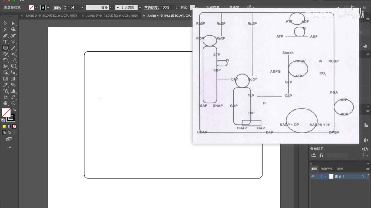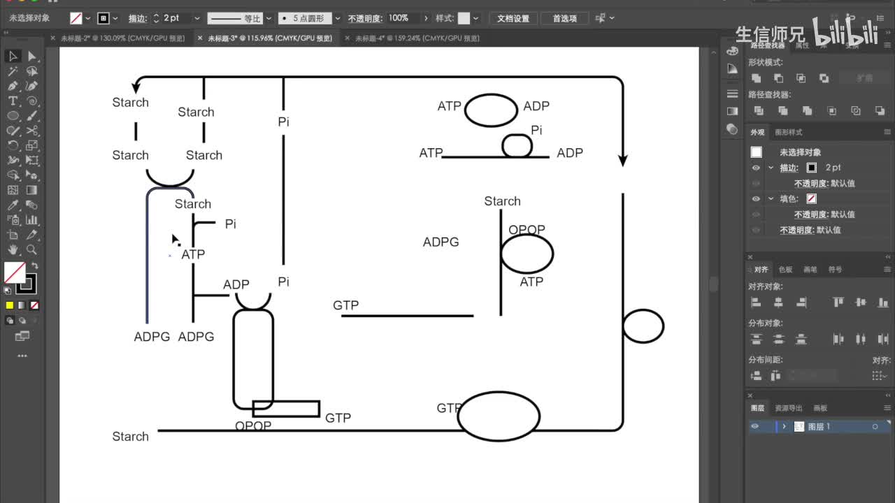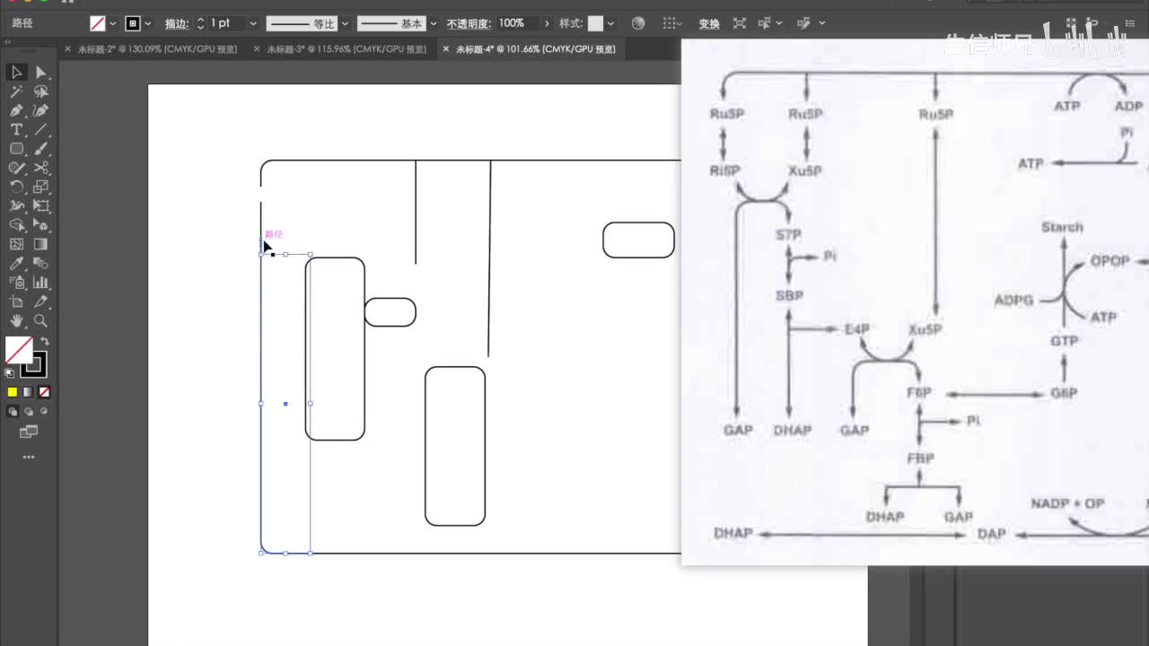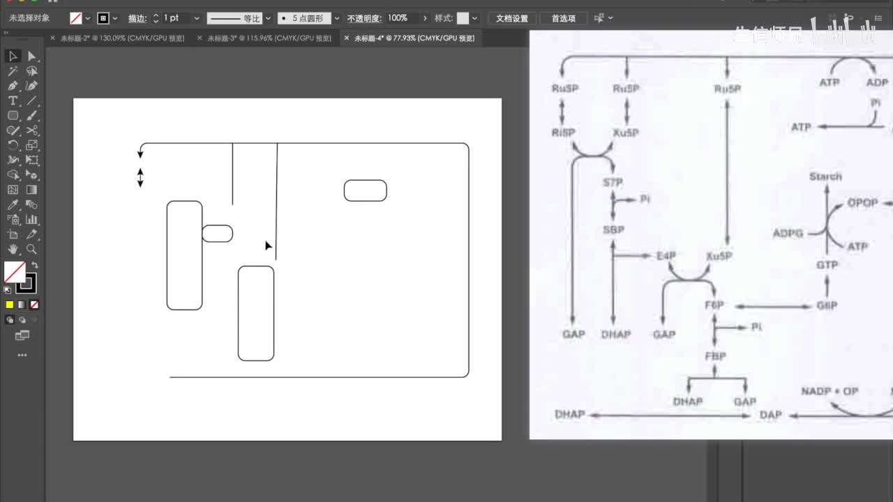 五十。好了,然后我们再把这个移上去。挪上去之后呢?我们就可以添加刚刚这里的加减号,这个用文字工具把它输入进去就可以了。好,这是讲到剪刀工具的使用。然后呢,我们看一下这个图。这个图呢实际上在生物化学里面应该是非常常见的一种图,这种代谢通路的图。那么。这张图的绘制呢,其实也比较简单。那么很多同学做做这种图的时候呢,他可能就会。根据书上的,比如说。这本书上有一个图。在哪里啊?啊,在这儿。