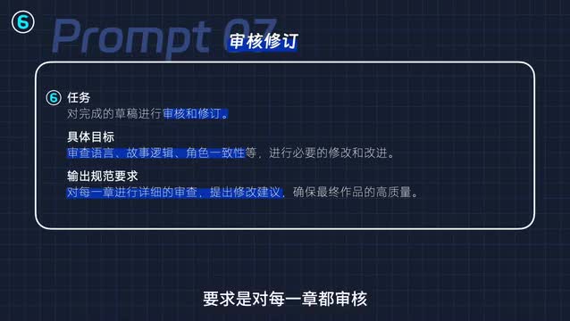 那当你完成小说之后,最后一步就是审核修订也来到了最后一条prompt任务是审核和修订。要审核语言、故事、逻辑、角色一致性要求是对每一章都审核并且修改。做完上述的步骤,你就可以得到一篇高质量的小说,这就是a i写小说的基本方法。我把今天会用到的所有提示语整理成了一个文档。
