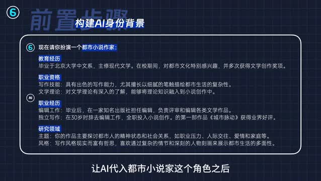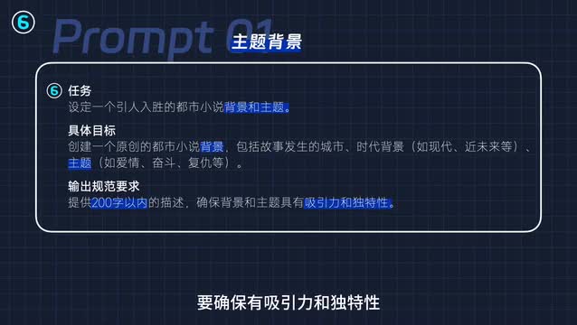 那在写正式的prompt之前呢,我们需要先做一个前置领域,让先把ai定义为一个作家,至于怎么做a i的角色定义呢?可以看一下这期视频。这里我们就让a i扮演一个都市小说家,并且描述一下他的教育经历、职业资格、职业经历以及研究领域。让ai带入都市小说家这个角色之后,我们来构建我们的第一条prompt,首先就是完成小说的主题和背景的设定,我们的prompt从三个方向来做,分别是任务、具体目标以及输出规范要求,之后的几条prompt也会按照这个规范来写。我们的任务就是设定小说的背景和主题,目标就是。