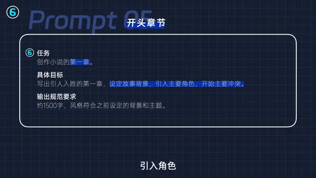 可以看到a i返回的第一章的内容要长了不念了我。另一部分可以暂停读一读,写的还可以是吧?那第一章写完了,接下来就是要给指令让它继续。接下来的章节来到我们的第六条prompt任务,是要完成小说的第x章。这里的x就是填写具体的章节,比如第二章、第三章等等,一直填到我们刚才说的第十四章。