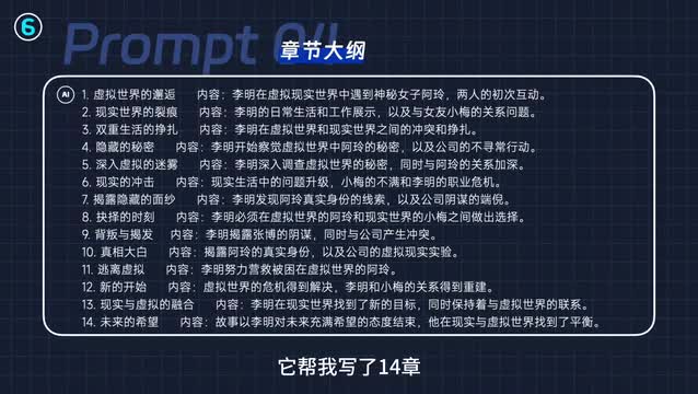 第四条prompt,我们就让他根据情节概览设计章节标题,要求设计每一章的重点内容和目标。这个小说我不想弄太长,就写十至十五章吧。他帮我写了十四章,给到了每章的标题和核心内容,那这个基本就是整个小说的结构了。如果你觉得这个大纲不够,可以让他把大纲细致到二级标题或者三级标题,今天我们暂时就用这个一级标题就可以。