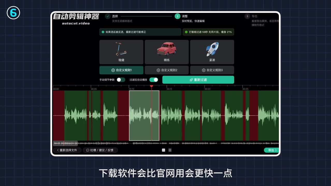 虽然说这个软件感觉完成度还不够高,但是相当的实用,就是你可以上传你的视频或者音频,然后这个软件就会自动帮你把空白的地方都删掉,你看这里红色部分都是删掉的,可以省去大量的重复劳动。实测的话下载软件会比官网用会更快一点,推荐尝试一下。第八个网站,讯飞创作大模型,是国内实际体验下来比较接近g p t的网站。你可以直接和他进行对话,还有内置一些创建功能,比如文档问答、简历生成,自动做p p t什么的。
