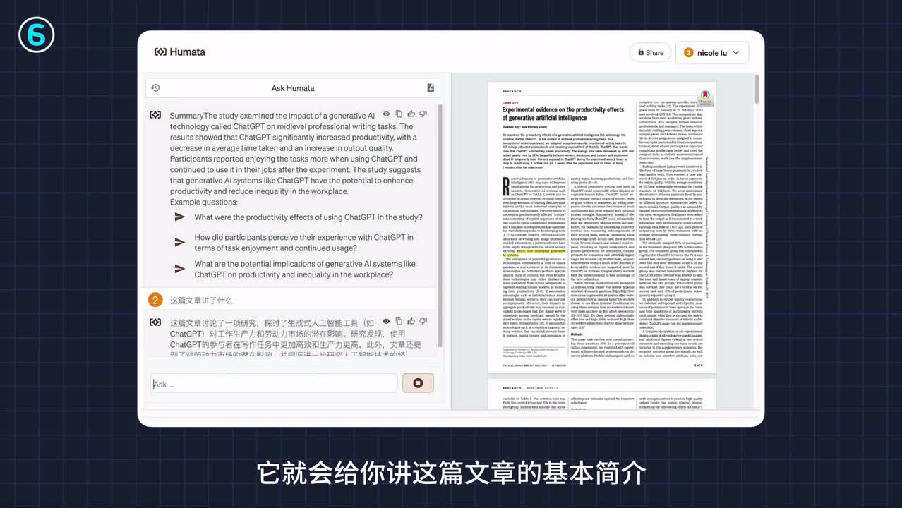 左边是对话框,右边是文档。直接用中文问他这篇文章讲了什么,他就会给你讲这篇文章的基本简介。当然更多详细的你也可以直接问。这里有一个要注意的呀,免费版只能上传六十页文档,购买你也不贵。