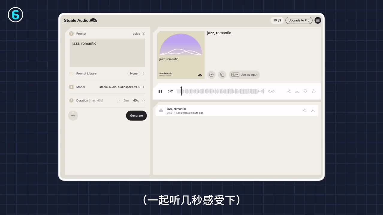 这里我们就写一首浪漫的爵士乐,就写jazz romantic。当然你也可以选预制好的提示词模板,然后点击生成,稍等一会儿这首歌就会写出来。好,我们现在来一起听一下。写的还可以对吧?roma这么简单都能写出音乐,你可以试试优化prompt音乐,结果会更好啊。