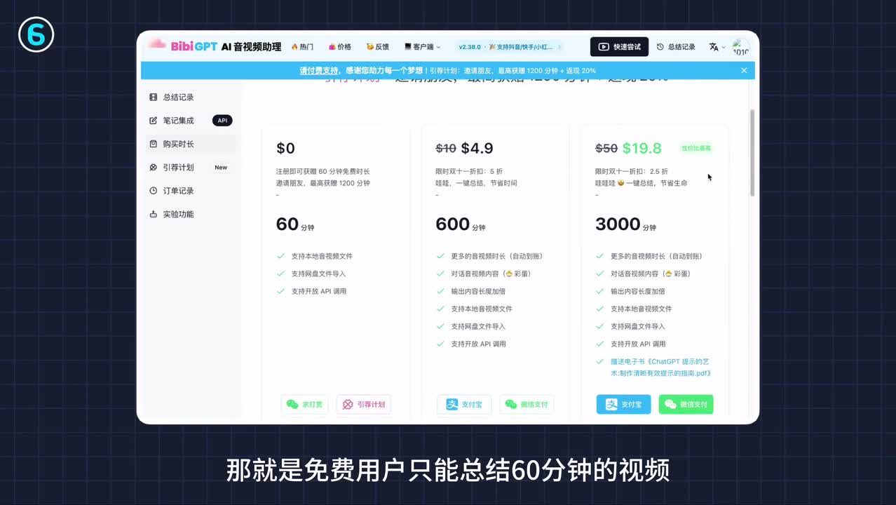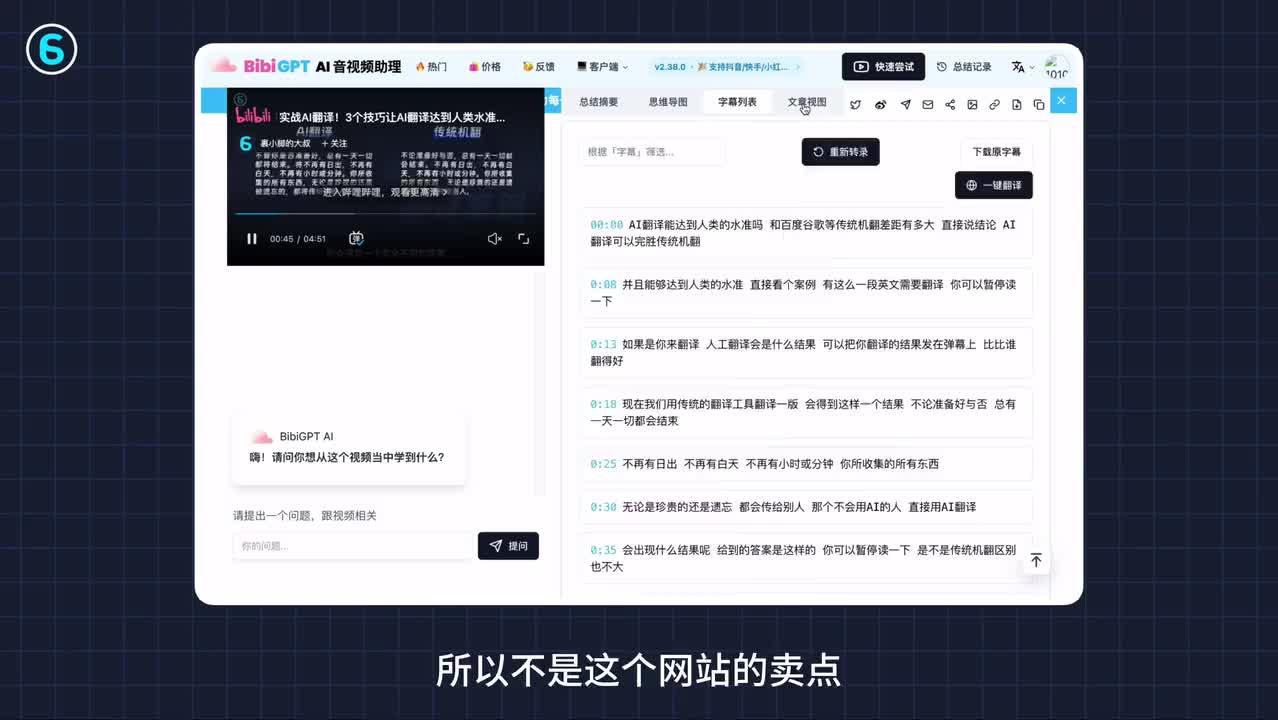 比如b站上这一个这个视频,就就把你所有视频的视频就可以非常的方便,大家千万别艾特他。这个网站也有缺点,那就是免费用户只能总结这个视频的视视频。如果不想氪金,还想要总结的更详细的话,你就看接下来的第六个网站通义听悟。它其实是个音视频综合处理网站,能够实时形成会议纪要。