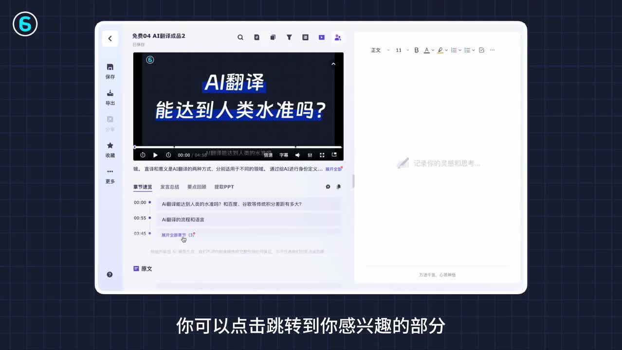 你可以把你感兴趣的视频下载下来传上去。比如我就上传我自己的视频,i翻译的视频可以可以形成关键词,全文概要、章节。概览你可以点击跳转到你感兴趣的部分,它会给你全文的文案,边听还可以边在右边做笔记。除了视频还可以填写播客r s s链接。