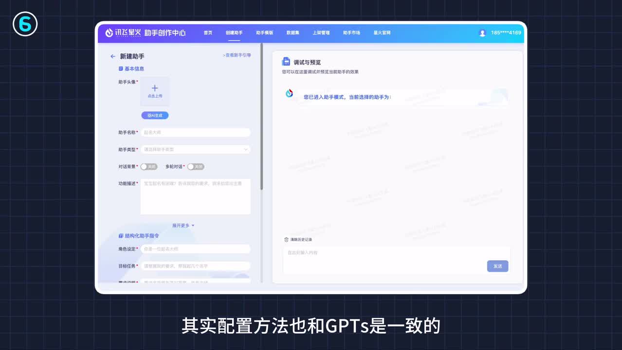 除此之外呢,他还有一个助手中心点,助手创作中心再点立即创建创建新助手。你就会发现进入到了一个和open a i p t s极其相似的配置界面。其实配置方法也和g p t t s是一致的。详细教程你可以看这期视频,它有个应用商店叫助手市场,里面有很多写好的小程序可以直接免费用。