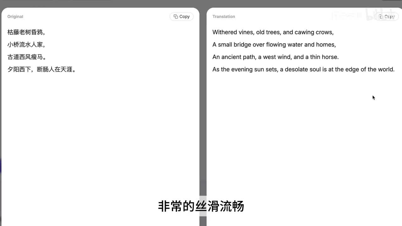 在中国的ai翻译中心一一点a i这是一个基于大模型的翻译软件,翻译效果毕竟天花板,非常经验。给大家示范一个例子,我们输入原诗的天净沙秋思,再看翻译结果,它保持原诗的意境和节奏非常的字滑流畅。我我们输入一个翻译中文盖地虎,宝塔镇河妖等等效果,翻译的语句自然通顺,用词也挺准确的。六s love p p p自动生成,打开slide a i功能,输入数字化能力对接发展的重要性,直接就生成p p t的大纲。