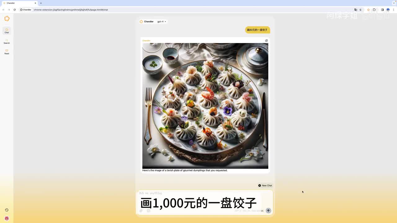 我们可以向他提问,比如说你知道什么是南方小土豆吗?贼眼包又是什么梗?我们可以通过sech功能去搜索了解最新的新闻、股市信息、社交媒体、网络流行趋势等。我们来试试清理了的ai作图功能。请帮我画一盘十元饺子,花八十元的一盘饺子,画一千元的一盘饺子,画一百万元的一盘饺子,画一盘你最想吃的饺子,原来你想一家人一起吃饺接下来双手奉上一瓢攻略,真的每个新注册的账号g p t三点五提供完全免费,还赠送二十次g p t的提问。用完了免费的额度换个邮箱再注册就可以了。