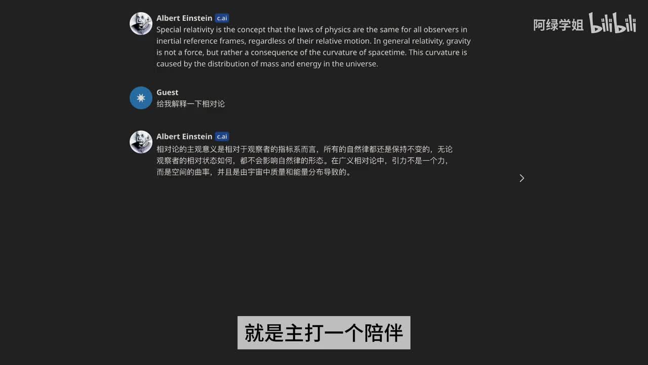 ai中可以跟世界上很多著名的人进行聊天,比如与马斯克你可以帮我去买螺蛳粉外卖吗?与爱因斯坦聊天,给我解释一下相对论,跟冷冰冰的chat g p t相比,就是主打一个陪伴。如果之后有更好用的ai工具面试,我也会及时更新。大家还有什么好用的ai工具呢?欢迎评论区一起来分享哦。请大家多多支持一下我的视频,一键三连,谢谢大家。