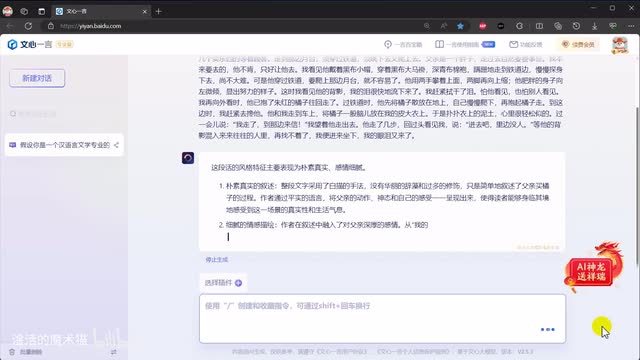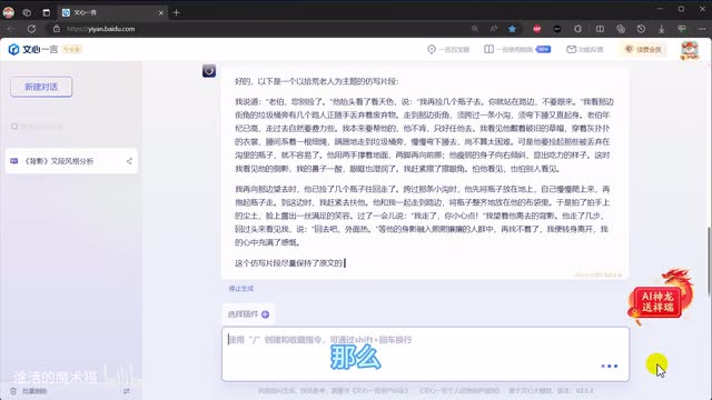 注意,目前非会员单次最多贴入两千字,而会员为单次五千字。如果文字比较多,建议分批发送和处理。可以看出,文心一言从语言、情感、描写方法等方面进行了解析。这些特点一方面可以为我们自己原创提供启发,另一方面也可以直接让a i参考他们来仿制生成内容。所以进入第二步,让文心一言来仿写提示词,为请你参照以上分析的风格特征。