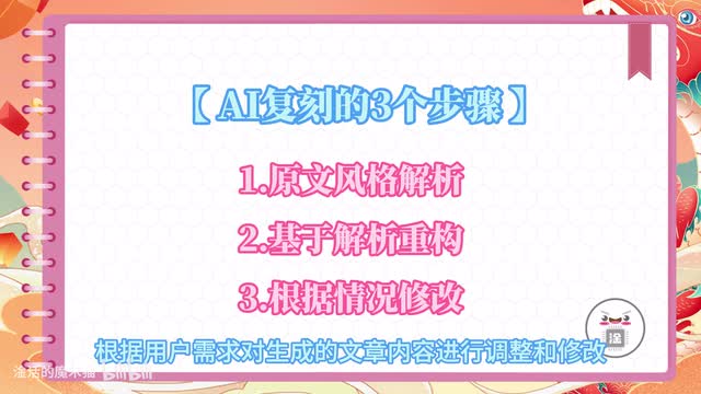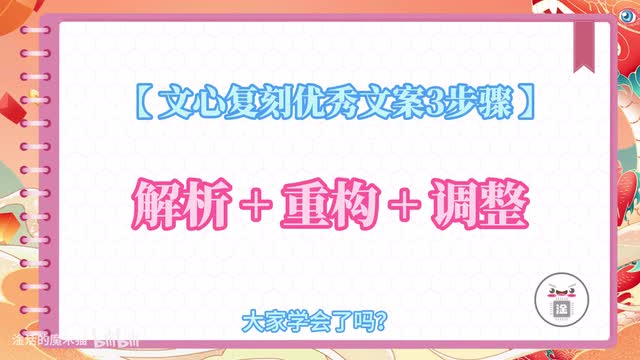 那么最后再来复习以下复刻优秀文案的三个步骤,可以概括为六个字,解析加重构加调整。大家学会了吗?希望大家都能成功复刻自己喜欢的优质文案,显著提升工作效率。早下班,喜欢的话不要忘了一键三连哦。
