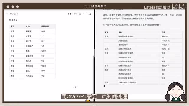 就论这两个答案来说,我觉得flow us更胜一筹,你们觉得呢?第二轮呢,我想让他们给出一个饮食方案。flows照样很快给出了答案,而chat g p t需要一点时间处理,a few moments later. 如果答案太长的话,它会有断掉的情况,不知道是不是我的网络问题。我们可以看到这里flow us很清楚的列出了饮食方案、注意事项和饮食表格。