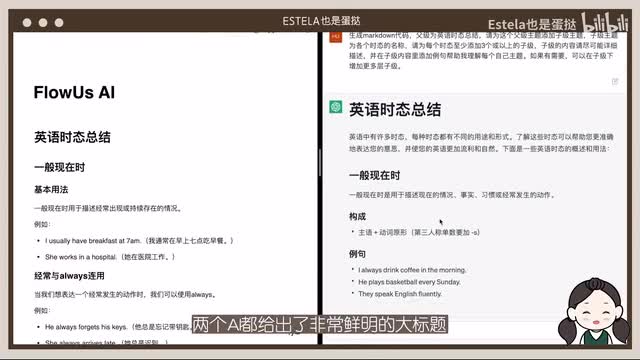 那么在这一轮我投chat b t一票,你们呢?那么这一轮呢我想让他们试着对英语的时态做一个总结,然后用markdown的代码方便我在后期改成思维导图。这一次呢两个ai都给出了非常鲜明的大标题、小标题和例句等,看起来完成度都不错,有一些细节方面的感受。呃,在我来看总结笔记的时候,我是需要复制chat g p t的内容,然后再去进一步的进行笔记的整合。