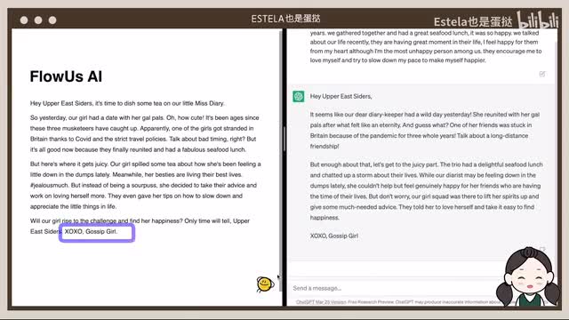 所以这一轮我投flow us你们呢。这一轮呢我想让他们帮我改变一下我的文章的风格,所以我想让他们用gossip girl电视剧的风格来帮我改写我的日记。他们都给出了经典台词,hey, a brief co x o o o o o, 内容方面都修改的不错,你们更喜欢哪一个呢?那这一轮呢我想看一下两个语言模型编故事的能力。