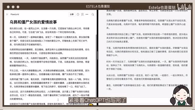 我想写一个关于乌鸦爱上僵尸女孩的童话故事,字数大概一千字。那么floods率先完成了,紧接着chat g p t也写完了。我看了一下这两个故事,flows把僵尸女孩给写完了,而chat p t把它们写到幸福的生活在一起。