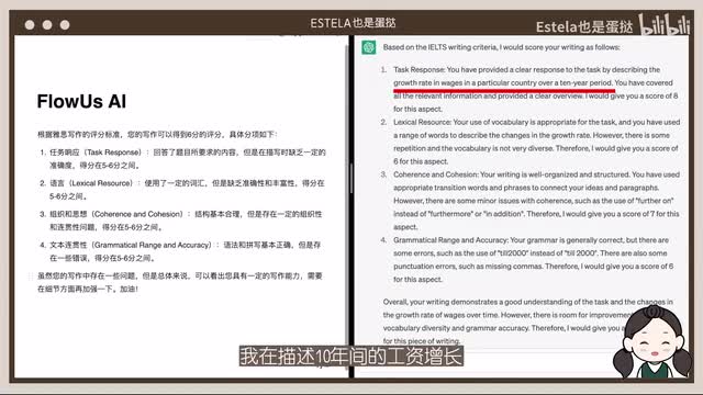 不同的是flow us是用中文回答的,给了我六分的评分,给了我一些建议。但是这些建议都是比较general,而chat g p t给了我七分,并且比较明确的指出了我在描述十年间的工资增长的这个观点非常明确。而且在词汇和段落的组织上都给了相应的tips,我觉得会比较更具有人性化。