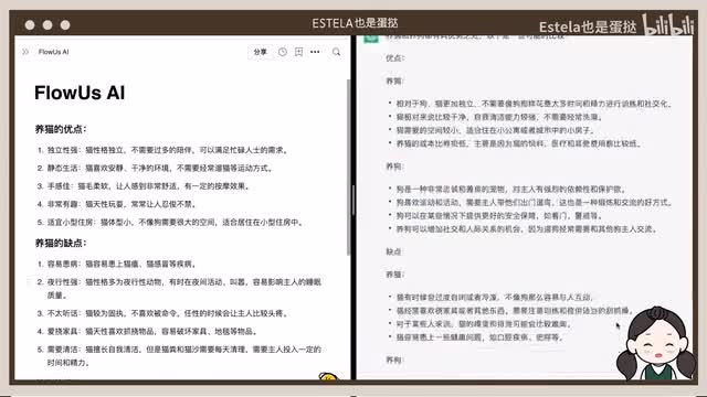 那么比较一下这两个答案。chat g p t按照优点和缺点的顺序,用boy points分别列出了养猫和养狗的不同。而floss在这里用了一个小标题的形式展示,并用数字标注,而每一点的前面都有一个小小的关键词。