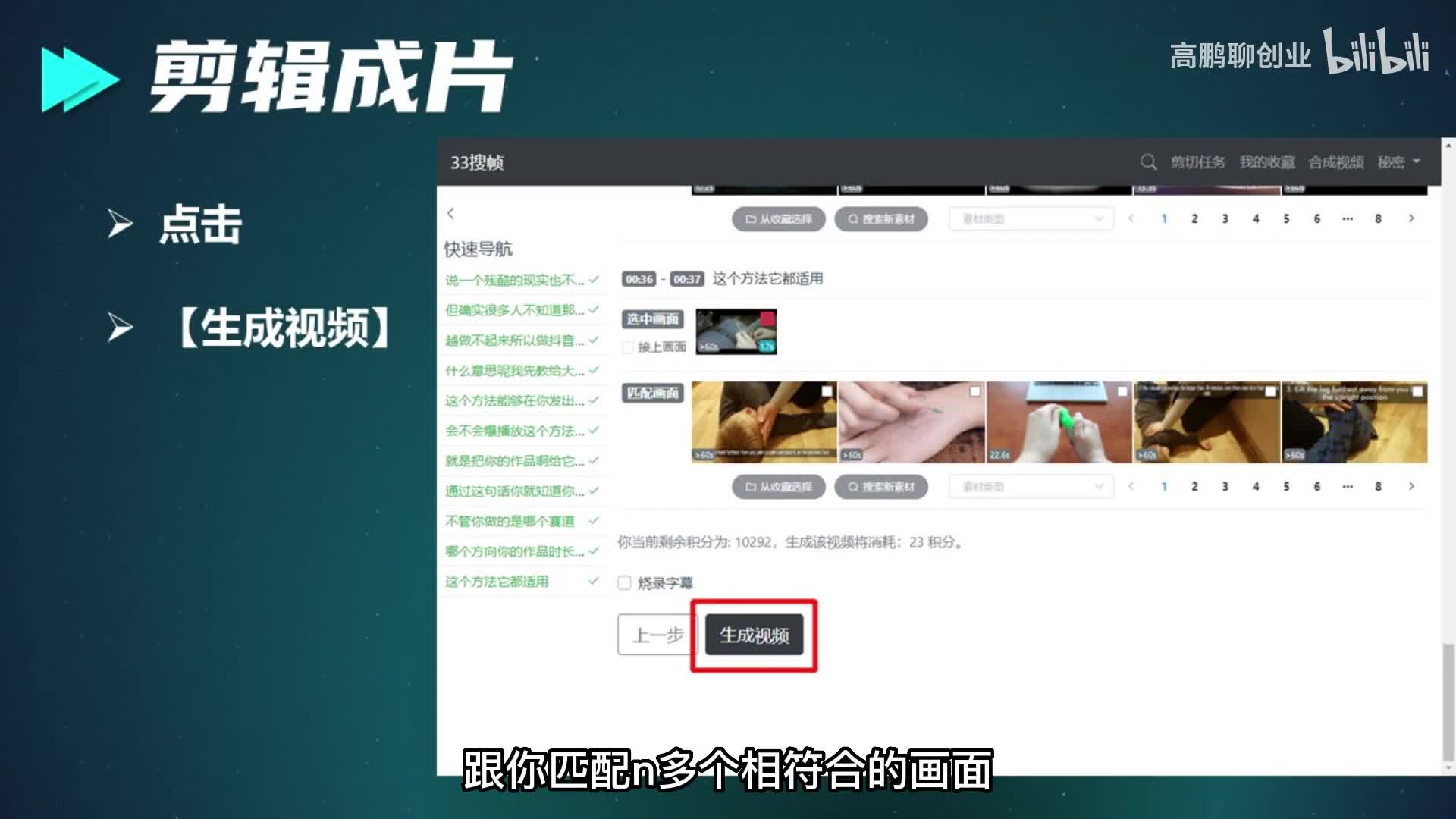 我们回到三三搜帧的首页,然后呢点合成视频,点击之后呢,它会根据你的台词跟你匹配n多个相符合的画面。我们选择好匹配的画面之后呢,拉到最底下有个生成视频,就能够生成这种高质量的原创视频了。我们一起来看一下效果。