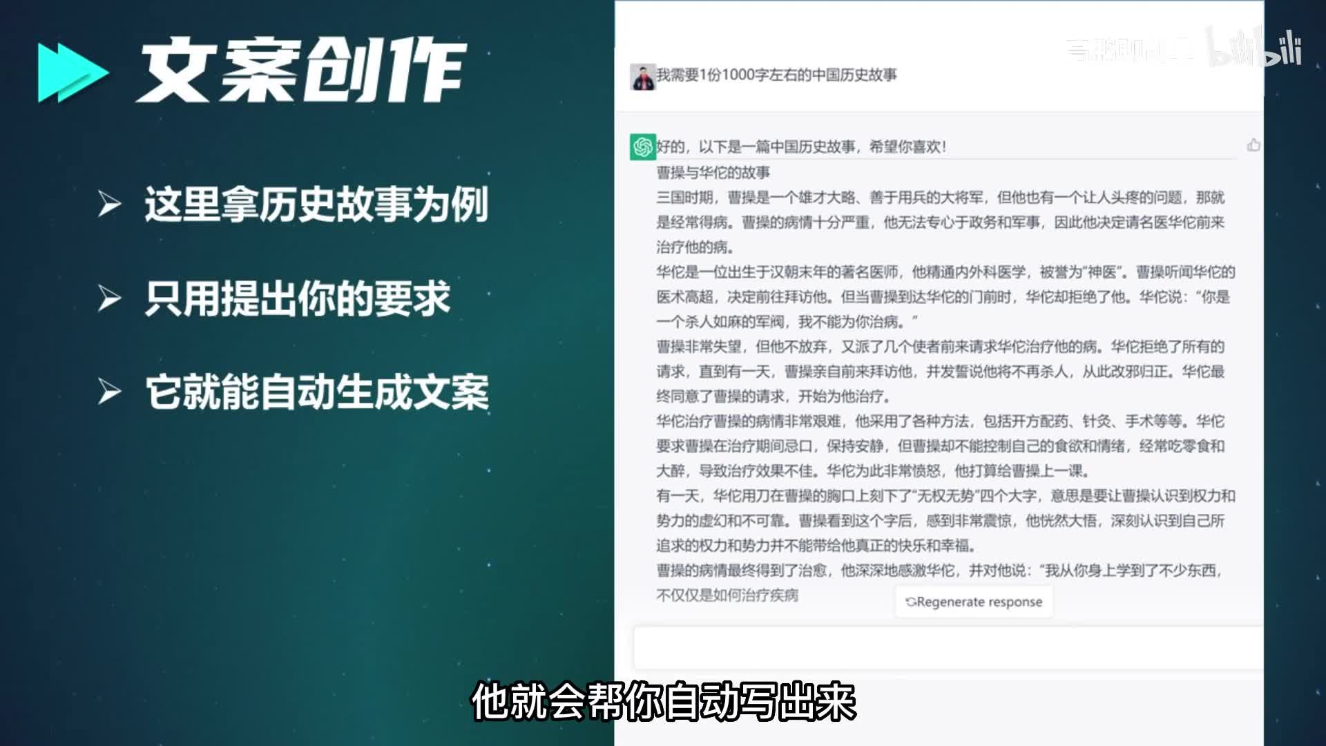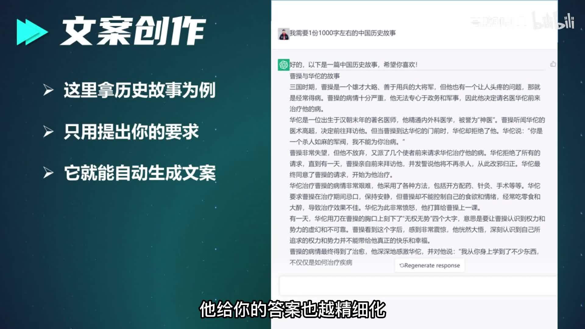 大家可以看一下右边我截的这张图,就是他给我的答案,差不多一千字左右,写的是曹操和华陀的故事。当然我只是演示啊,大家可以发挥自己的脑洞,你想让他写一个什么的故事,他就会帮你自动写出来。比如说你可以让他写一个民间故事,你还可以加上定语,比如说你给我写一个湖南地区的民间故事,或者你给我写一个偏门冷门的民间故事,他都能够帮你写出来。