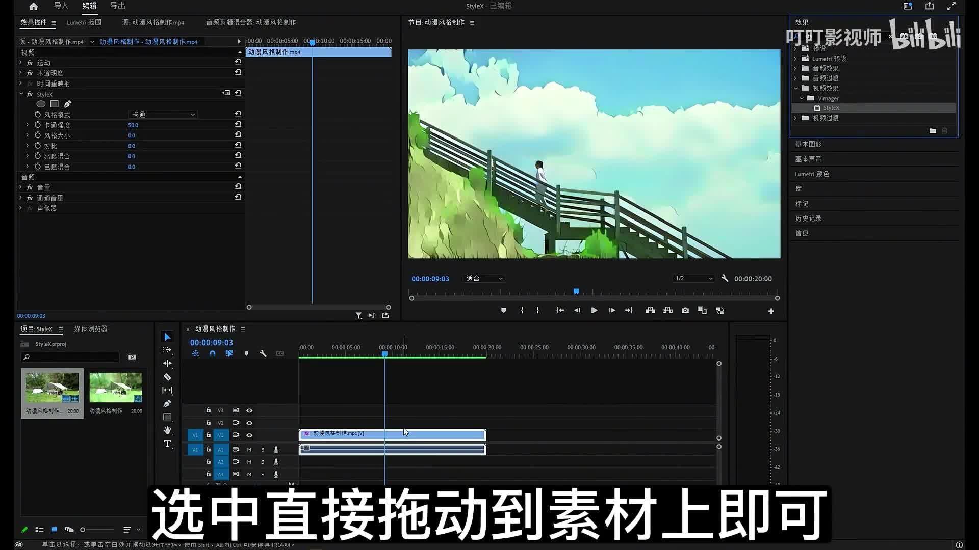 在效果中直接搜索style x选中,直接拖动到素材上即可,动画效果就会被直接应用到视频上。
