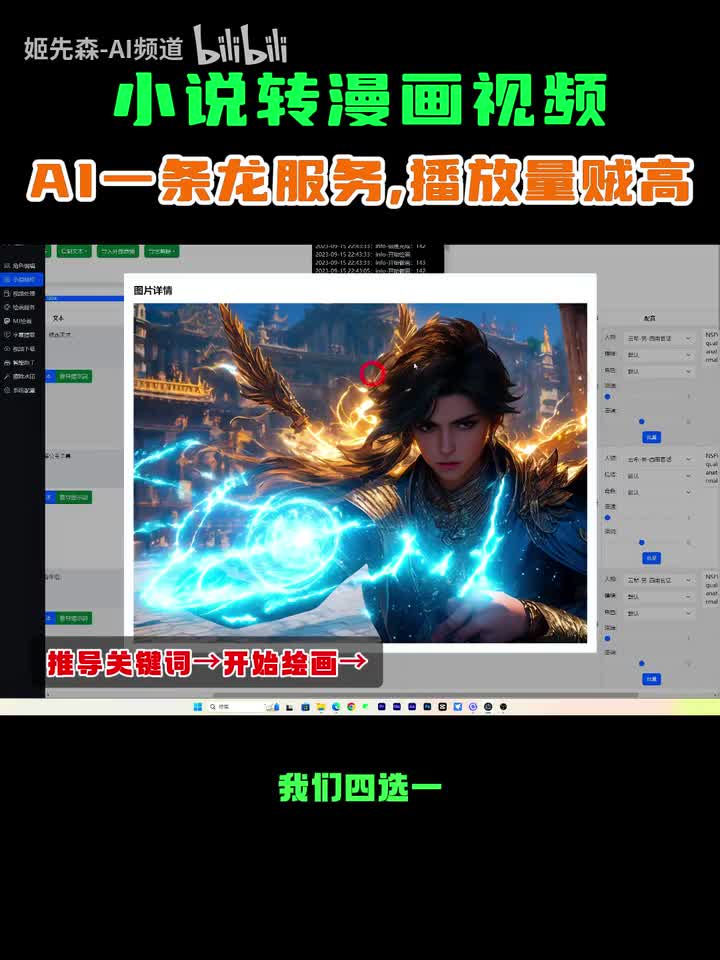 我们复制小说,再让ai给我们生成一个黄金五秒开头,选择一个合适的开头跟小说进行组合,然后复制去制作小说,把小说粘贴进来,随便设置一个音频,随便设置一个默认,然后点击提交,点击推导关键词,就会自动的把小说转换成ai绘画的英文关键词,等待完成,再点击开始绘画,接着就会生成四张图片,我们四选一,挑选一张合适的,等所有图片生成完成,随后选择配音的人物,语气、语速,然后点击批量,再选择关键帧动画,点击生成音频,随后完成最后一步,导出剪映草稿,再剪映,进行添加字幕、特效、音效、转场、背景音乐等等,让视频开头的作图片,然后更多用户观看,这样才能获得更多的播。