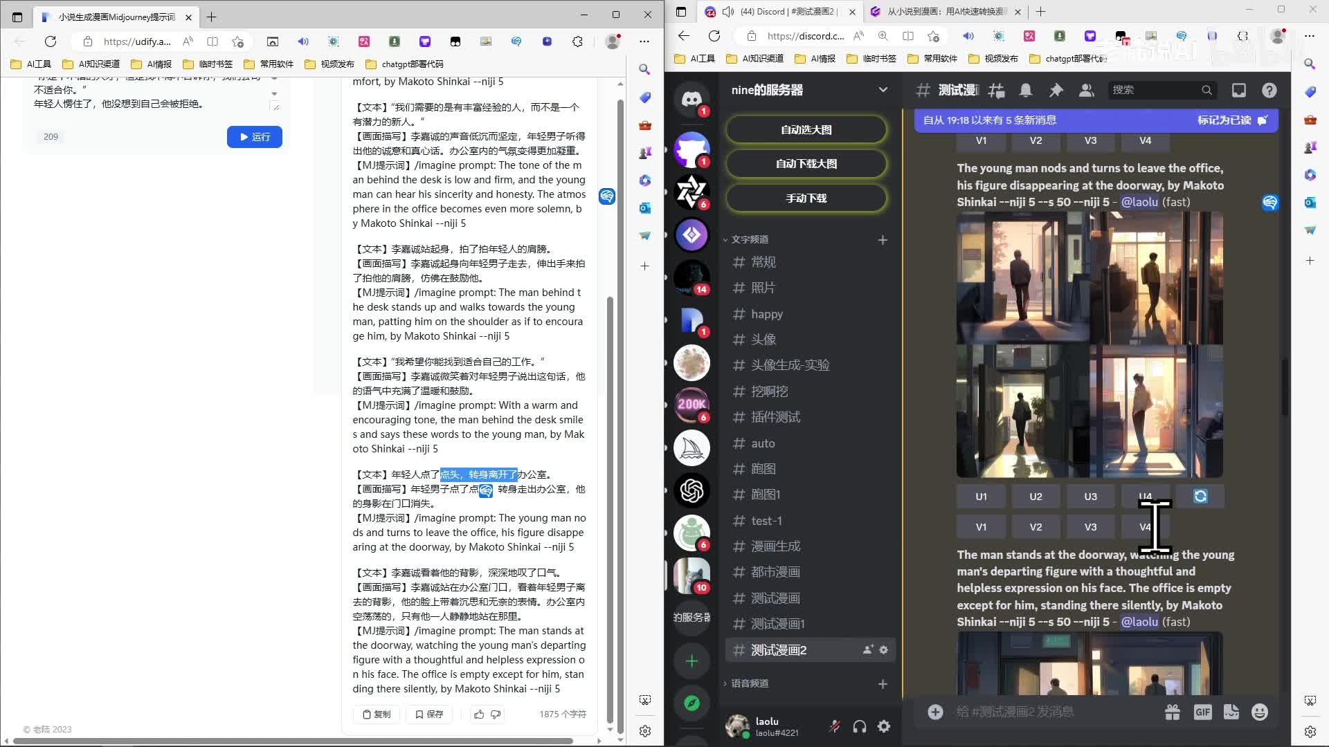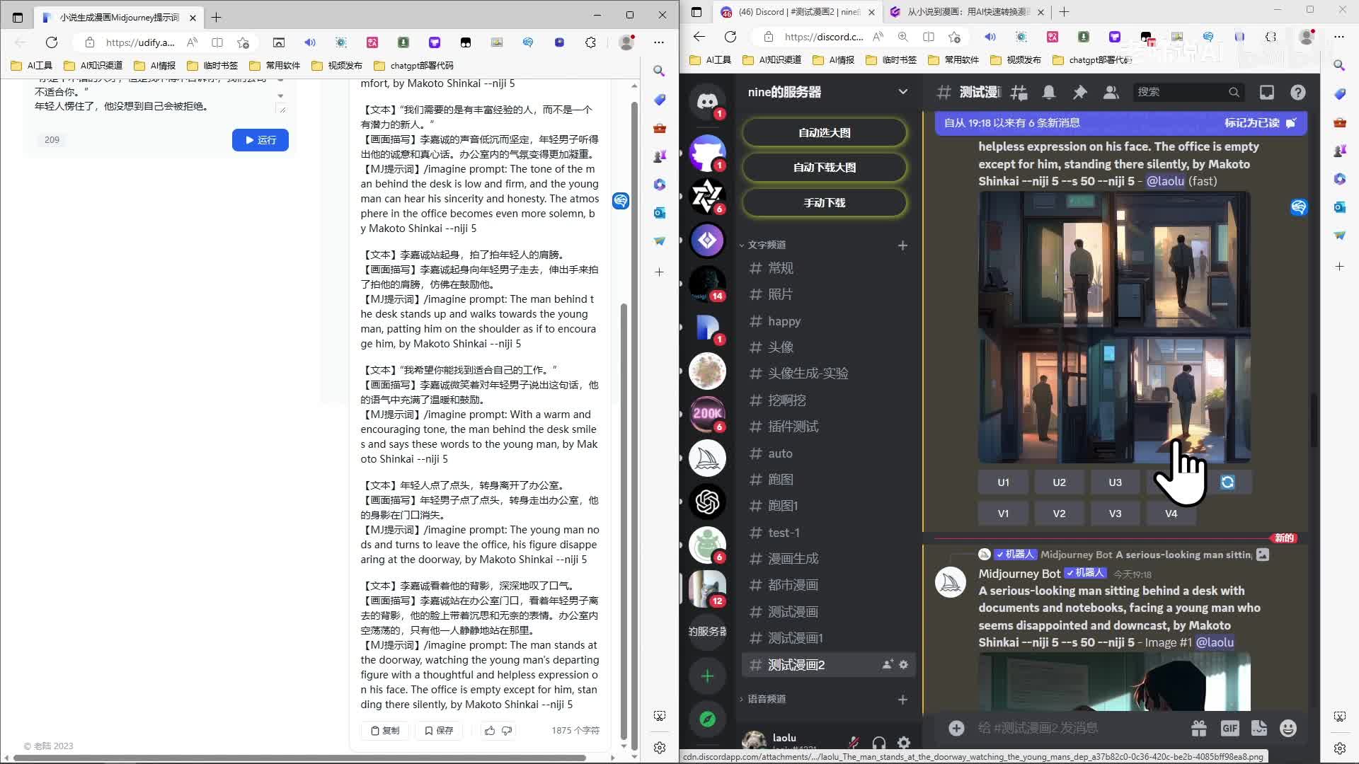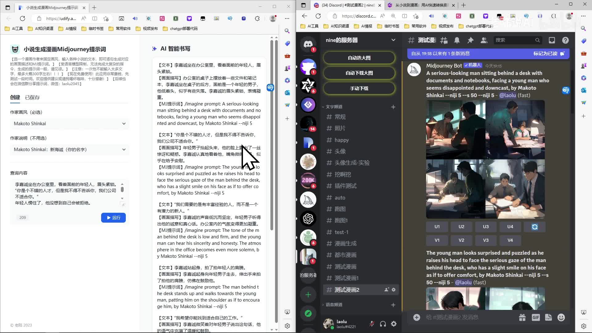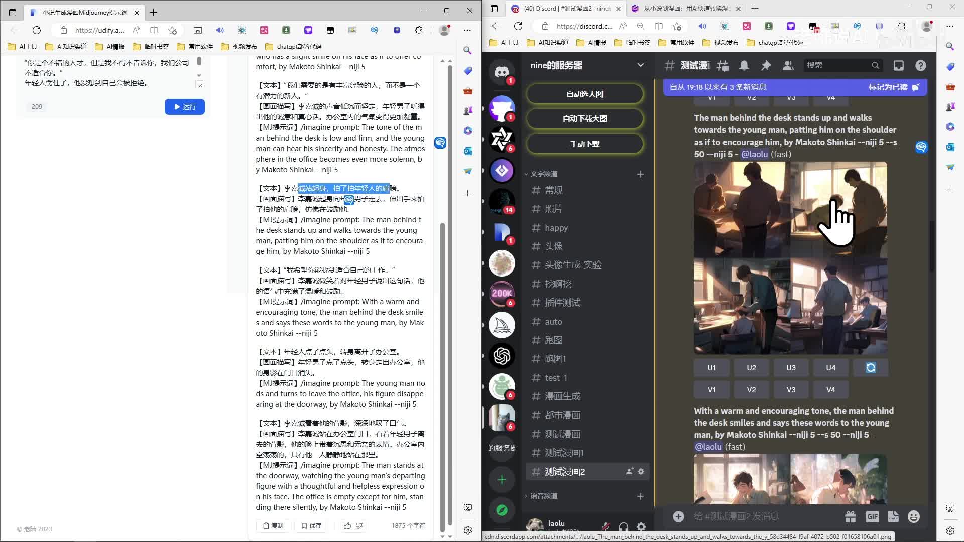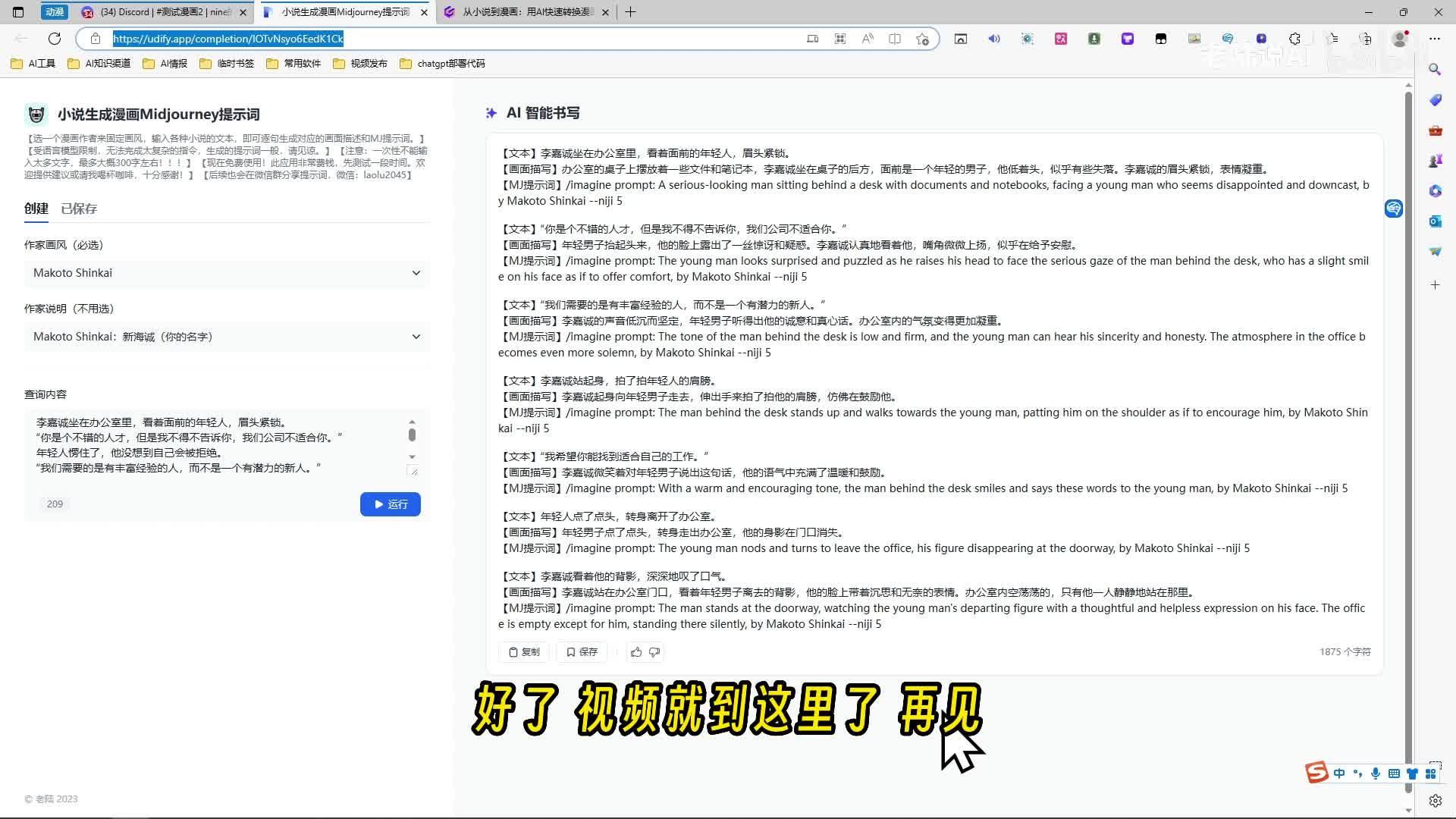 然后年轻人被拒绝。哈。拍肩膀是吧?离开办公室。好,嗯,结束,这就是整个流程啊。嗯,点赞如果不错的话,下期我再更新一下这个提示词是怎么写的,如何生成这种东西啊,提示词的分享。