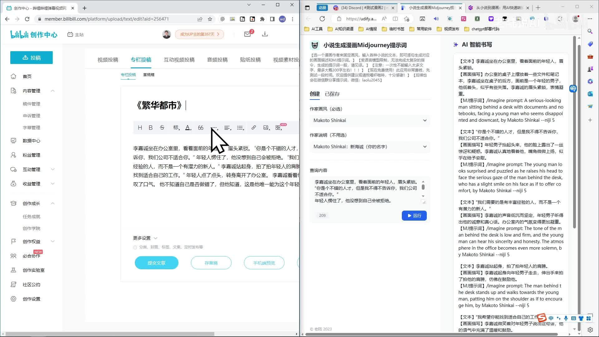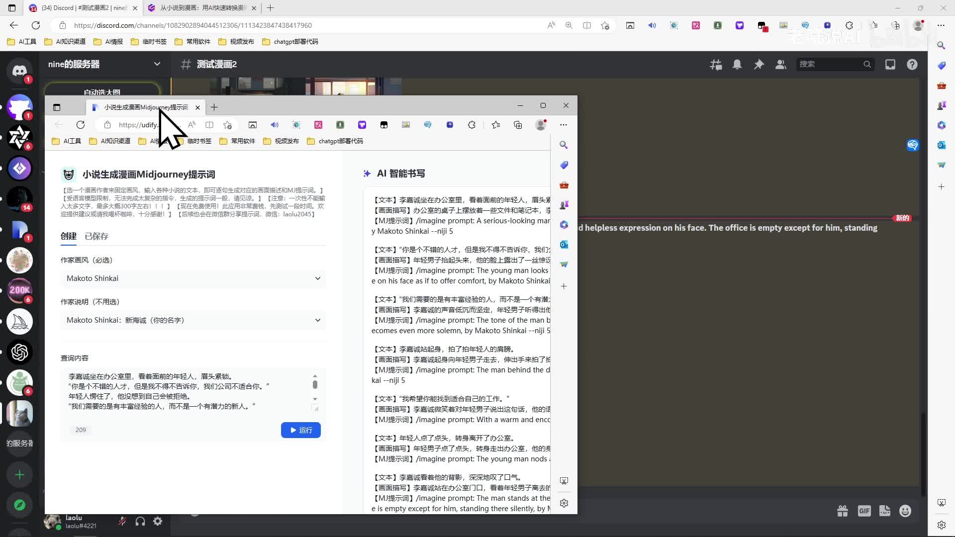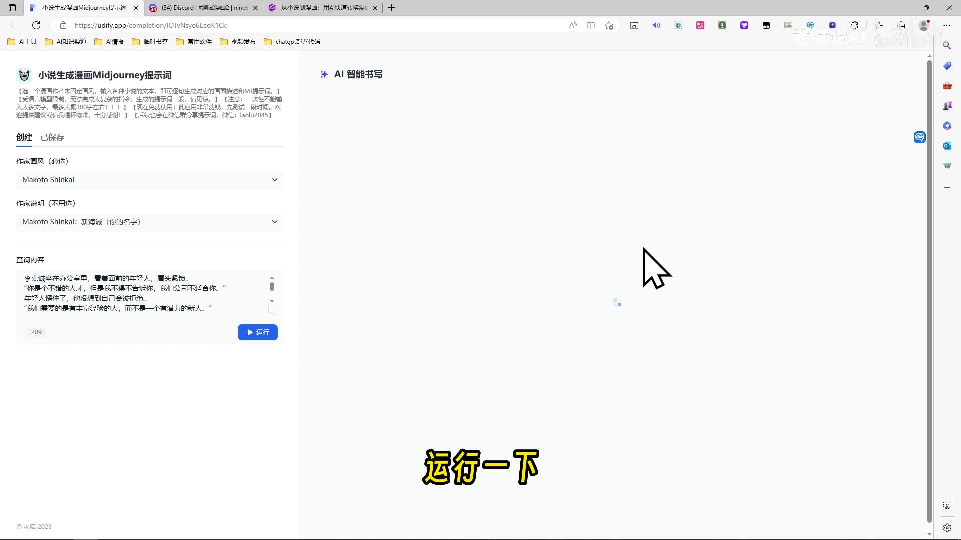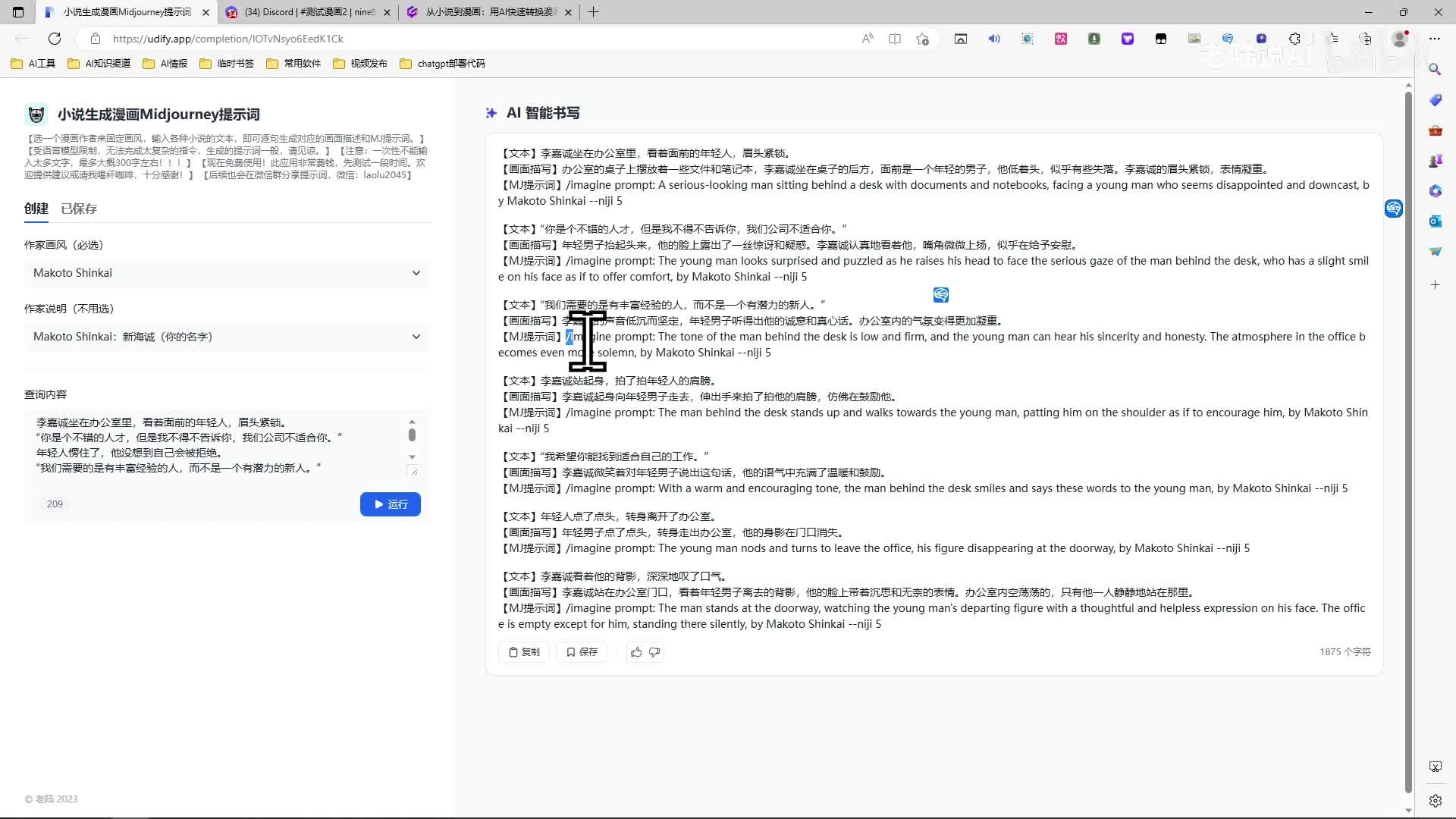 那这边是画风说明啊,我们选都市嘛,新海诚吧,就啊上面主要是上面选一下新海城。然后把内容粘贴进来,两百个字可以的,呃,最多三百个字啊,两百多个字差不多的,再多就会出问题了,转换不出来了。运行一下。好了,转化成功。呃,前面是文本,后面是画面的描写,在下面是提示词,那我把提示词全粘贴粘贴进m j。