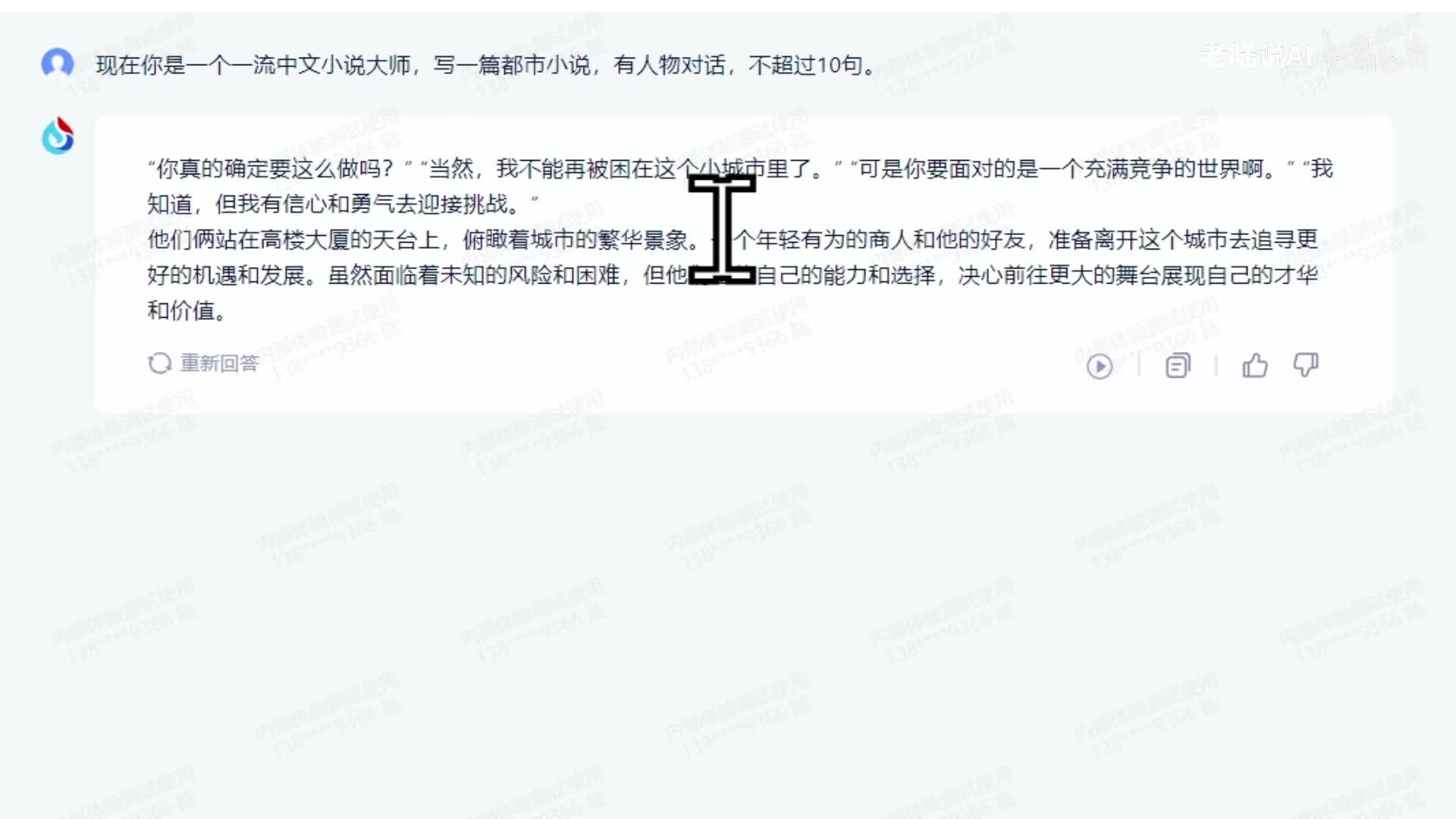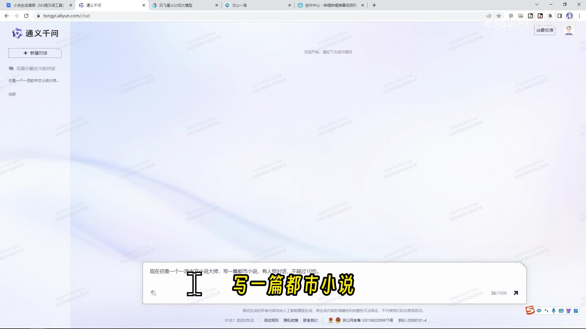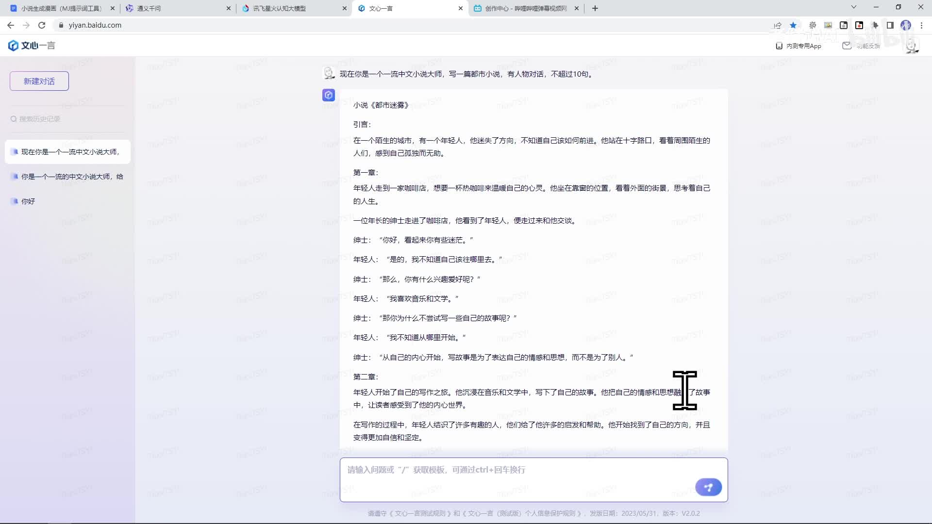 呃,最后是用没九点生成图片。啊,我们先看用大元模型生成短篇小说啊,我们这里使用的话是中文的大元模型,通义千问讯飞和文心一言。嗯,我提示词已经说好了,写一篇都市小说。对话少一点啊,这个也一样都生成一下。啊。