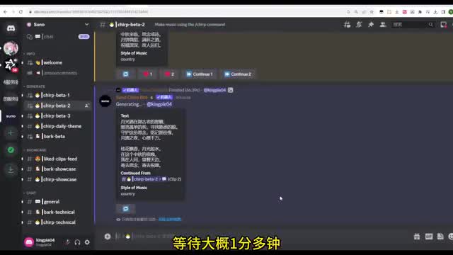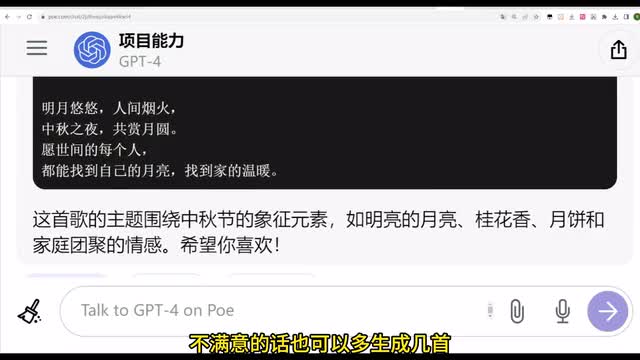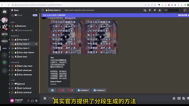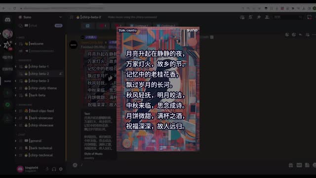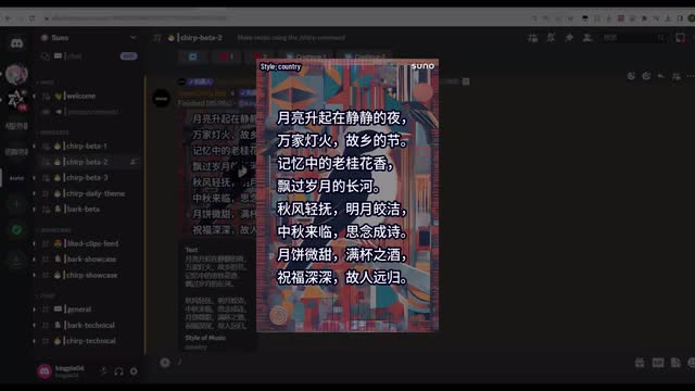 中秋临近,我们让g p t帮我们写一首以中秋为主题的歌词。整体还不错,就用它吧,不满意的话也可以多生成几首。然后我们打开sono a i官网加入discard。随便找一个cher频道,输入church发送。