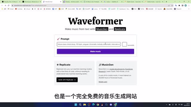 继续在这个节奏上面去增加歌词,把这个歌曲延展,然后生成一首完整的歌曲。we former也是一个完全免费的音乐生成网站,在这里输入提示词,还有这个音乐的长度。就可以直接生成,但是这个最长只能生成一个三十秒的短音乐。