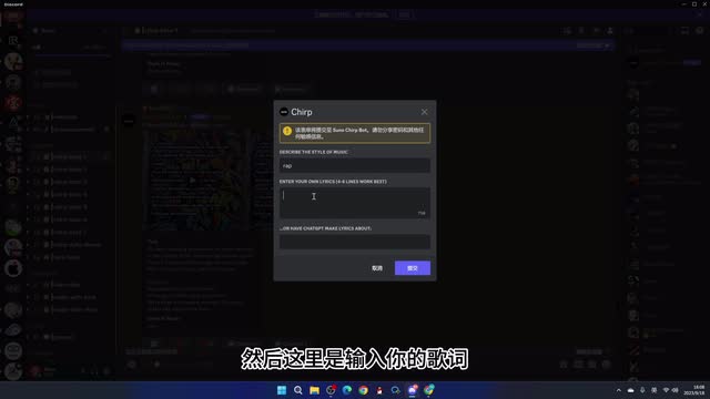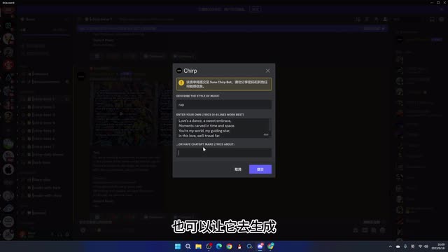 他就会出一个对话框,第一个是指的你音乐的类型,譬如说我要生成一首具有rap风格的。然后这里是输入你的歌词。你要是不知道这个歌词怎么写的话,一样可以交给chat g p t,让它生成一首歌词。