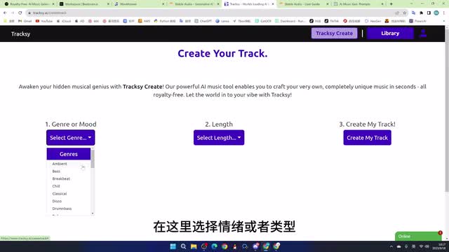 接下来让我们一起来看看吧。taxi是一个完全免费的音乐网站,它的操作非常简单,在这里选择情绪或者类型。这里可以选择音乐的时长,它是可以生成一个十五秒到三分钟的音乐。