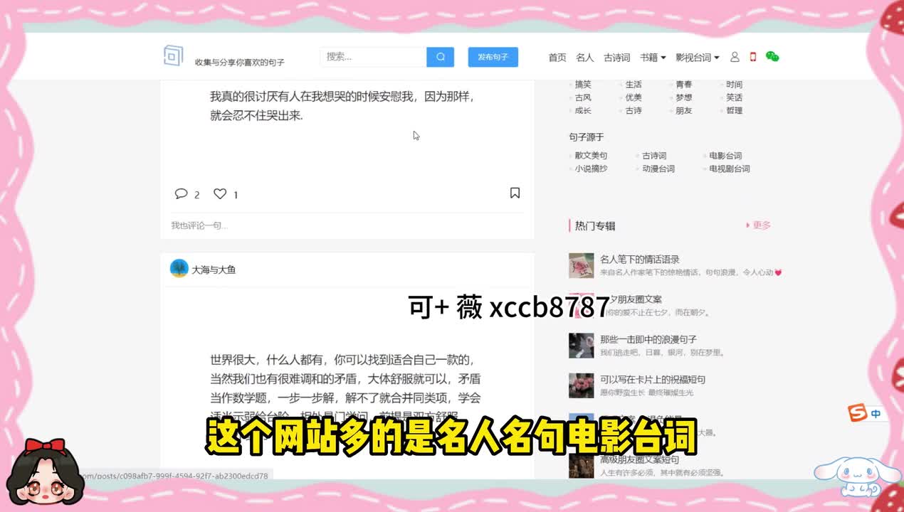 这个网站呢可以实时捕捉全网的热点。第五个句子控,这个网站呢多的是名人名句、电影台词、散文、美剧、小说摘抄,可以说是你的文案经济的来源地。