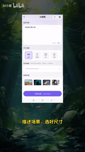 a i视频支持文字和图片两种方式生成视频描述场景,选好尺寸,再根据需求调整运动幅度,选中你想呈现的视频风格就能生成视频了。