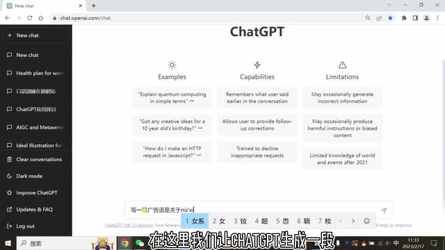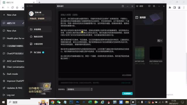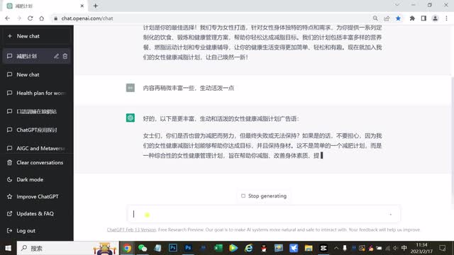 首先我们打开chat g p t并新建一个对话,在对话中输入需要chat g p t生成的文本内容。在这里我们让chat g p t生成一段。关于女性减脂计划的广告语,chat g p t将自动生成我们需要的内容。