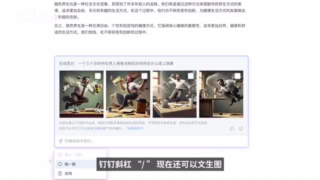 改语气,作为助手他主要负责帮你开个好头,在过程当中友好协作,也许最后帮你收个好尾。除了文本钉钉斜杠,现在还可以纹身图。和纹身表格。纹身图这个在国内实际落地的a i里边应该算是头一个。实际上你是可以在文档当中直接跟a i对话的。