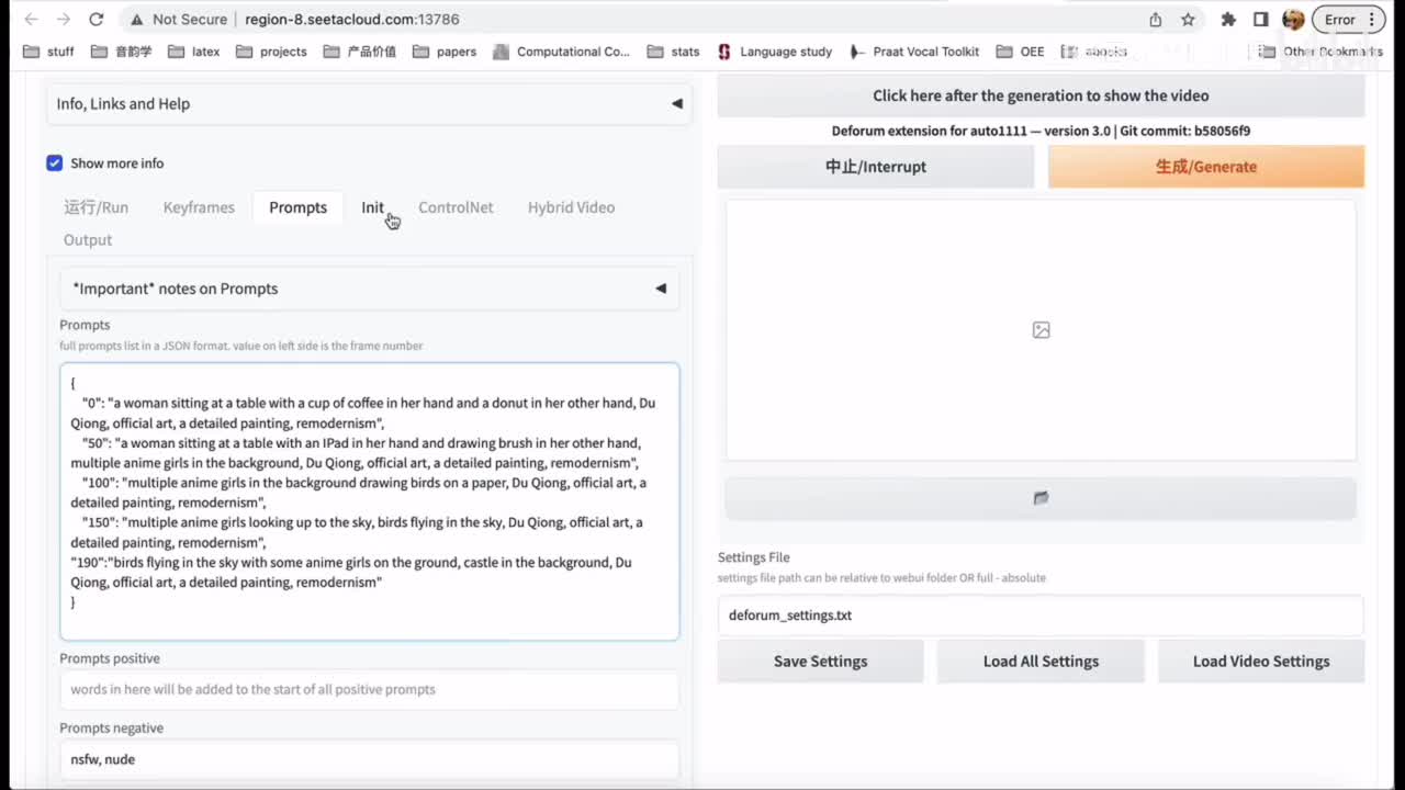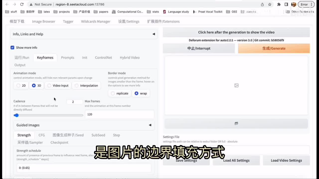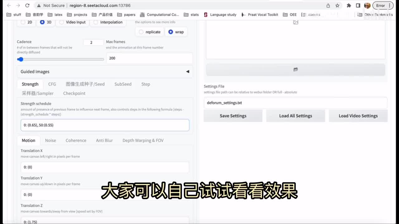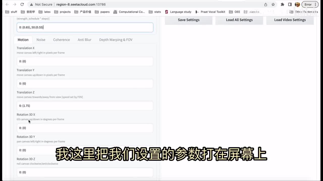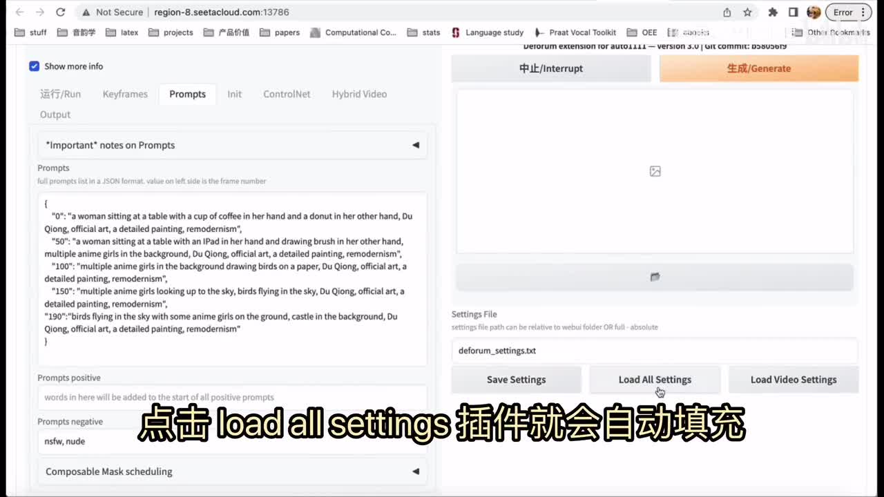 到这里我们就设置的差不多了。还想再补充一句,我们刚刚辛辛苦苦设置了这么多,如果以后想在其他的动画中继续使用,可以点击这里的fighting。下次打开的时候呢,点击load all settings,插件就会自动填充你刚刚的全部设置,可以说是一劳永逸。然后我们点击生成,开始念咒,生成之后呢,点击click here after the generation to show the video。
